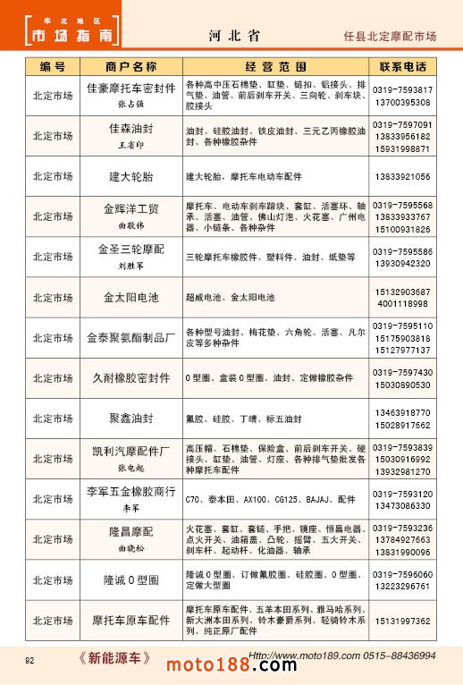 中國摩配市場從上世紀九十年代開始經過高速度的發(fā)展,正逐步減速,摩托車行業(yè)也漸呈式微,與之緊密相關的后市場的配件與維修也呈逐步下滑之勢,取代摩托車的在發(fā)達地區(qū)是汽車,欠發(fā)達地區(qū)是電動兩輪、電動三輪,甚至電動四輪車,隨著經濟的發(fā)展,出行的多樣化,也給了消費者多重的選擇。目前現(xiàn)有的摩托車及配件市場,也不再是以純摩托車為主體,有的市場電動車取代了摩托車,有的商店也是混合經營,這些變化在《市場指南》里面都有所反應。這次《北方指南》一些小市場不再單列,并入到相應的省份中去;以前去市場的公交線路,書中也不再列入,因為現(xiàn)在的地圖導航功能十分強大,既新又準。