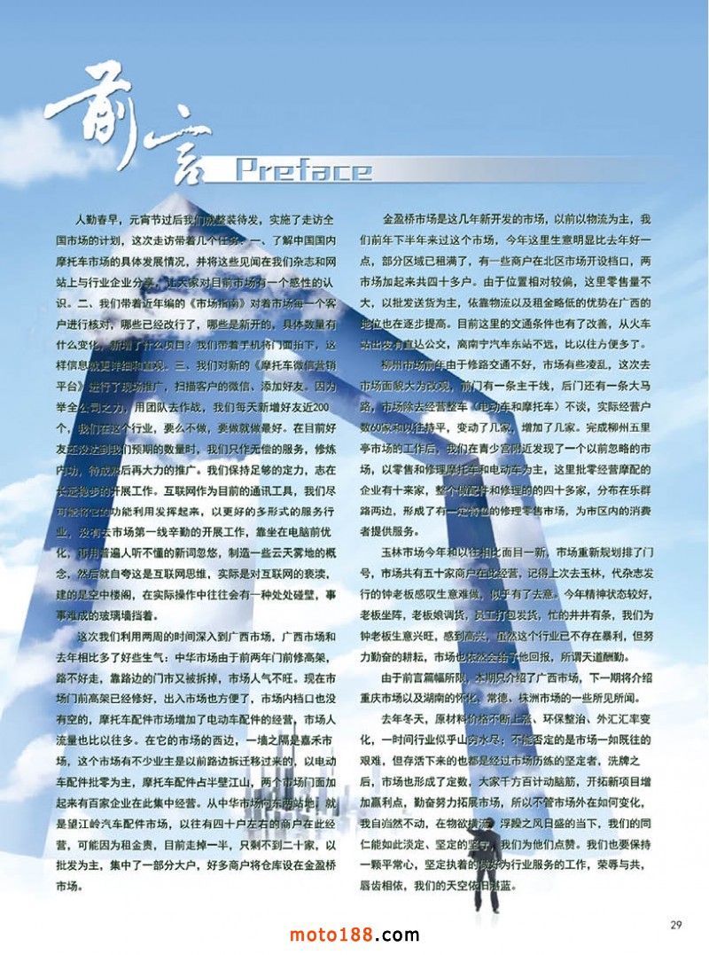 人勤春早,元宵節(jié)過后我們就整裝待發(fā),實施了走訪全國市場的計劃,這次走訪帶著幾個任務:一、了解中國國內(nèi)摩托車市場的具體發(fā)展情況,并將這些見聞在我們雜志和網(wǎng)站上與行業(yè)企業(yè)分享,讓大家對目前市場有一個感性的認識。二、我們帶著近年編的《市場指南》對著市場每一個客戶進行核對,哪些已經(jīng)改行了,哪些是新開的,具體數(shù)量有什么變化,新增了什么項目?我們帶著手機將門面拍下,這樣信息就更詳細和直觀。三、我們對新的《摩托車微信營銷平臺》進行了現(xiàn)場推廣,掃描客戶的微信、添加好友。因為舉全公司之力,用團隊去作戰(zhàn),我們每天新增好友近200個,我們在這個行業(yè),要么不做,要做就做最好。在目前好友還沒達到我們預期的數(shù)量時,我們只作無償?shù)姆眨逕拑?nèi)功,待成熟后再大力的推廣。我們保持足夠的定力,志在長遠穩(wěn)步的開展工作?;ヂ?lián)網(wǎng)作為目前的通訊工具,我們盡可能將它的功能利用發(fā)揮起來,以更好的多形式的服務行業(yè),沒有去市場第一線辛勤的開展工作,靠坐在電腦前優(yōu)化,再用普遍人聽不懂的新詞忽悠,制造一些云天霧地的概念,然后就自夸這是互聯(lián)網(wǎng)思維,實際是對互聯(lián)網(wǎng)的褻瀆,建的是空中樓閣,在實際操作中往往會有一種處處碰壁,事事難成的玻璃墻擋著。