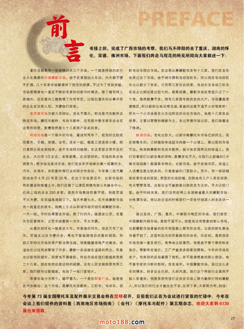 今年第73屆全國(guó)摩托車及配件展示交易會(huì)將在昆明召開,目前我們正在為會(huì)議進(jìn)行緊張的忙碌中。今年在會(huì)議上我們提供的資料是《西南地區(qū)市場(chǎng)指南》《會(huì)刊》《摩托車與配件》第五期雜志,歡迎大家到6130展位來領(lǐng)取。