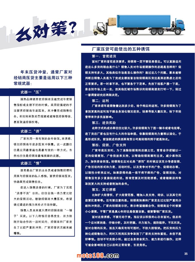 2017.8月《摩托車/電動(dòng)車與配件》雜志,歡迎大家閱讀日期:2017-07-31 點(diǎn)擊:2378 查看原圖 全部展開![]() ![]() ![]() 內(nèi)35 廠家壓貨有政策,經(jīng)銷商有什么對(duì)策?