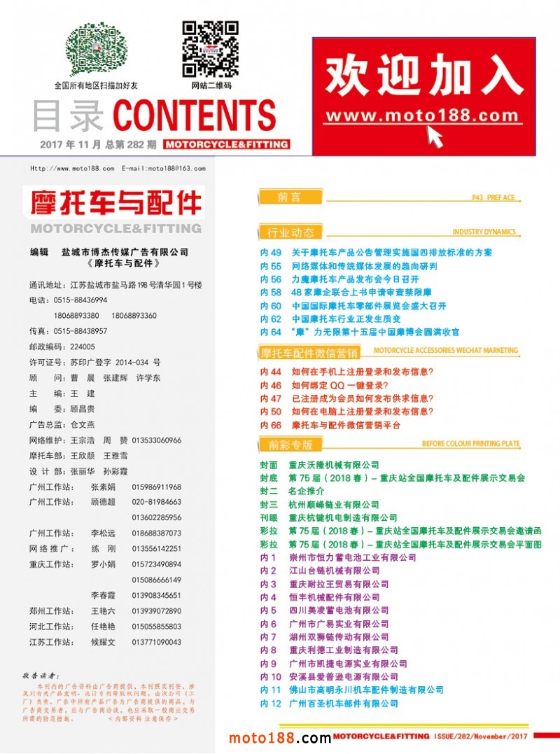 國內(nèi)首本中英文雙語《中國摩配外貿(mào)市場指南》,為從事外貿(mào)的企業(yè)提供了工具。這本書在廣州秋季全摩會(huì)上首發(fā)。還將參加明年的江門和重慶春季全摩會(huì)。歡迎行業(yè)朋友帶上名片或者手機(jī)掃二維碼,到4079展位來領(lǐng)取《中國摩配外貿(mào)市場指南》和《摩托車與配件》11期雜志。