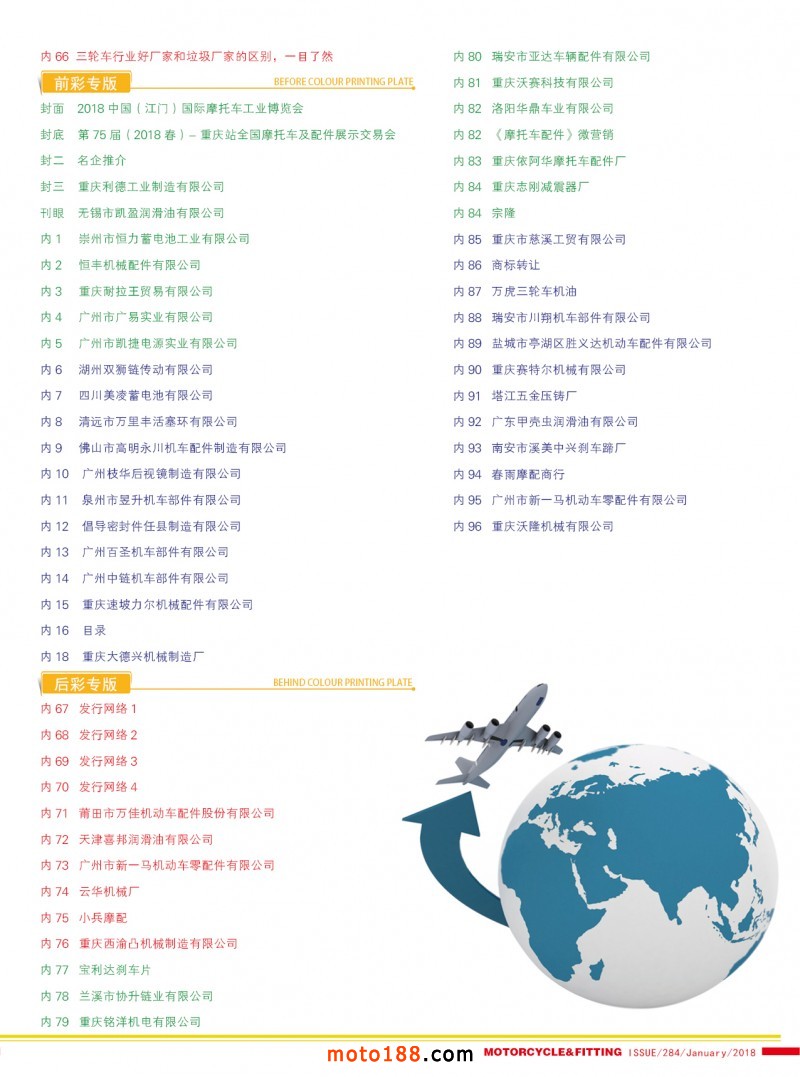 2018年已經(jīng)到了,新的一年里,我們通過成功的轉(zhuǎn)型,為未來發(fā)展奠定了良好的基礎(chǔ),外貿(mào)企業(yè)服務(wù)的應(yīng)用軟件也正在測試。18年全年出刊12期雜志(含上、下半年會(huì)刊),2月份是春節(jié),七月份是高溫季節(jié),這兩個(gè)月份停止出刊,我們將更多的時(shí)間和精力用在微信運(yùn)用和推廣及服務(wù)上,未來摩托車配件行業(yè),我們通過微營銷《摩托車與配件》兩大品牌,為行業(yè)提供立體服務(wù),不光為企業(yè)品牌宣傳還為行業(yè)企業(yè)營銷提供多渠道的服務(wù),直白地說就是努力幫企業(yè)多掙錢,我們已經(jīng)走上了這條道,我們堅(jiān)定不移的走下去,同時(shí)有更好的服務(wù)的形式,我們也會(huì)告知企業(yè),讓傳統(tǒng)的經(jīng)營插上互聯(lián)網(wǎng)的翅膀,使中國制造一帶一路走向世界,這是我們的工作重點(diǎn),也是我們雜志社的道義和責(zé)任,愿行業(yè)企業(yè)和我們攜手,共克時(shí)艱,共謀通達(dá)。