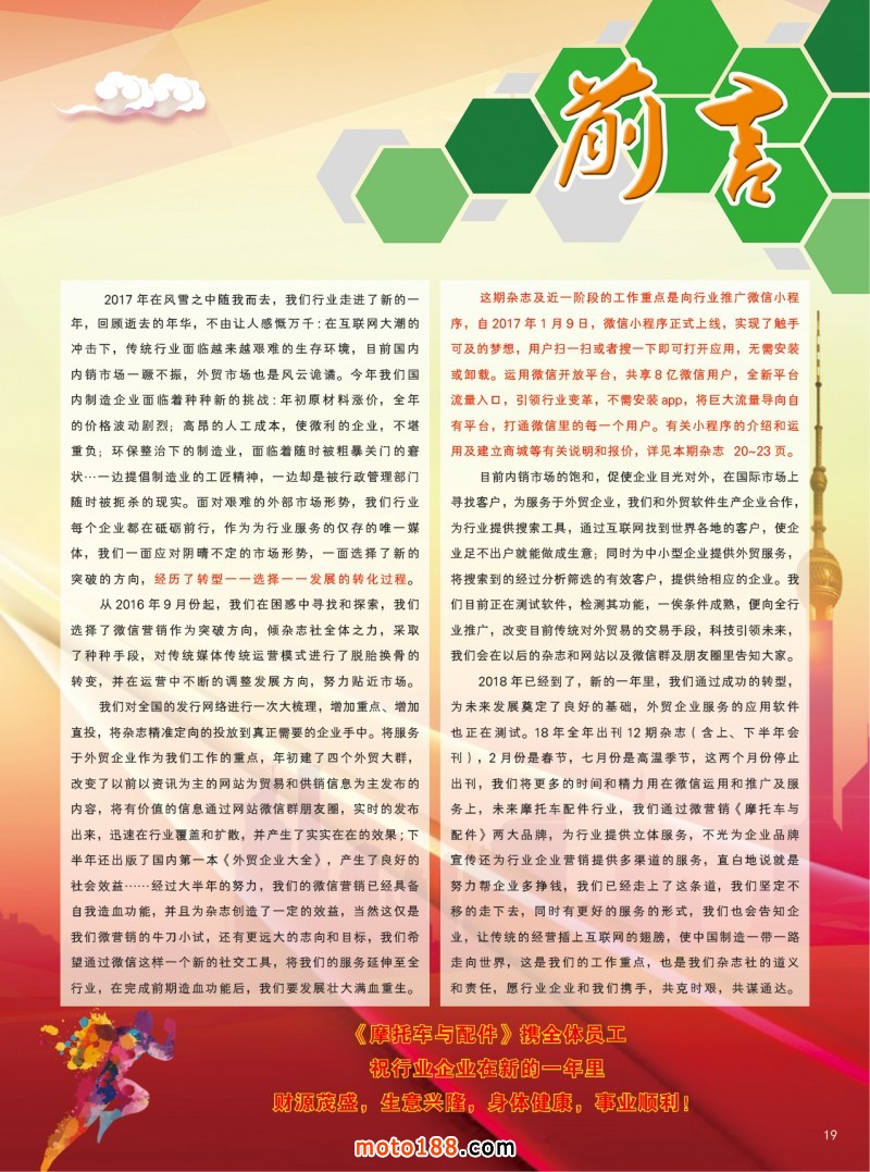 2018年已經(jīng)到了,新的一年里,我們通過成功的轉(zhuǎn)型,為未來發(fā)展奠定了良好的基礎(chǔ),外貿(mào)企業(yè)服務(wù)的應(yīng)用軟件也正在測試。18年全年出刊12期雜志(含上、下半年會刊),2月份是春節(jié),七月份是高溫季節(jié),這兩個月份停止出刊,我們將更多的時間和精力用在微信運用和推廣及服務(wù)上,未來摩托車配件行業(yè),我們通過微營銷《摩托車與配件》兩大品牌,為行業(yè)提供立體服務(wù),不光為企業(yè)品牌宣傳還為行業(yè)企業(yè)營銷提供多渠道的服務(wù),直白地說就是努力幫企業(yè)多掙錢,我們已經(jīng)走上了這條道,我們堅定不移的走下去,同時有更好的服務(wù)的形式,我們也會告知企業(yè),讓傳統(tǒng)的經(jīng)營插上互聯(lián)網(wǎng)的翅膀,使中國制造一帶一路走向世界,這是我們的工作重點,也是我們雜志社的道義和責(zé)任,愿行業(yè)企業(yè)和我們攜手,共克時艱,共謀通達。