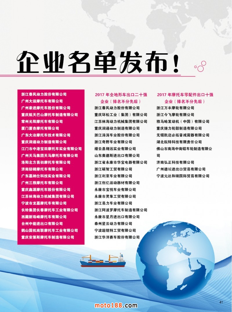 2018.3月《摩托車/電動車與配件》雜志,歡迎大家閱讀日期:2018-03-06 點擊:1295 查看原圖 全部展開![]() ![]() ![]() 內41 2017年摩托車行業(yè)出口六十強企業(yè)名單發(fā)布!