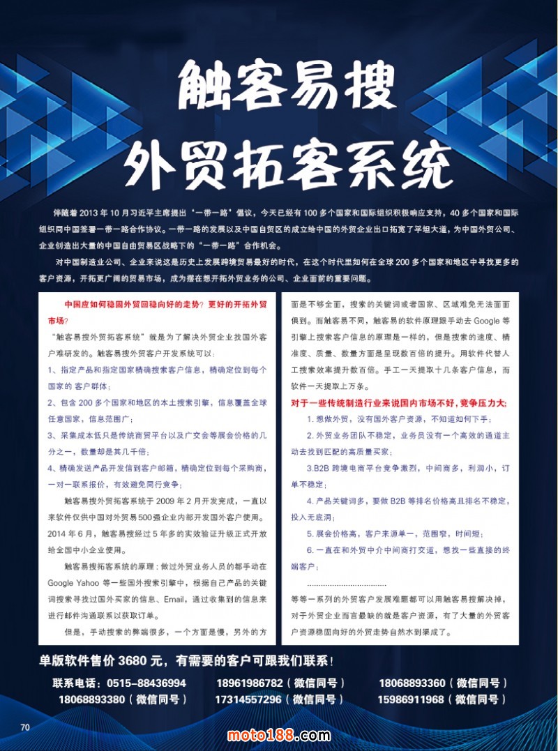 3、為了突破傳統(tǒng)的營銷手段和模式,充分發(fā)揮互聯(lián)網(wǎng)的作用。我們向行業(yè)引進了幾款外貿(mào)及小程序軟件,通過互聯(lián)網(wǎng)絡(luò),運用軟件搜索,尋找全球的摩托車配件買家。