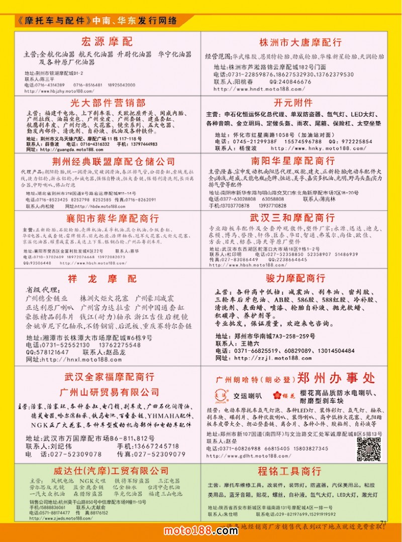 《摩托車與配件》傳統(tǒng)媒體與新媒體的結(jié)合,以及我們腳踏實(shí)地的工作。這一年多來,雜志已經(jīng)華麗的轉(zhuǎn)身,并且拓展出新的發(fā)展空間,可為摩配行業(yè)企業(yè)提供更多的服務(wù)形式。目前我們己基本將全行業(yè)的從業(yè)人員加為微信好友,為國內(nèi)外貿(mào)企業(yè)建了四個(gè)群,同時(shí)又建國內(nèi)五大市場(chǎng)群,方便了業(yè)務(wù)開展和企業(yè)互動(dòng);完成了對(duì)全國市場(chǎng)的新一輪的走訪,對(duì)國內(nèi)摩配市場(chǎng)有了一個(gè)全面的準(zhǔn)確的認(rèn)識(shí);完成了對(duì)目前現(xiàn)有摩配生產(chǎn)廠家的資料更新。2017我們蓄勢(shì)待發(fā),2018我們揚(yáng)帆起航!