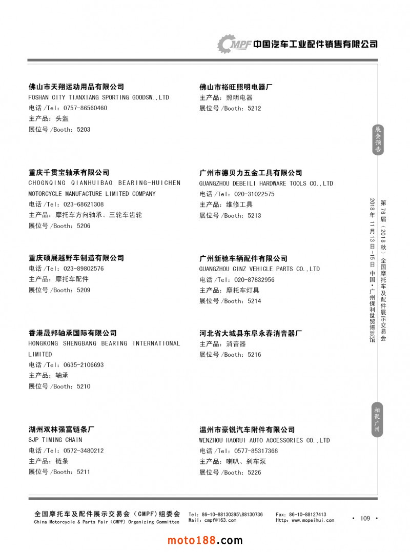 內(nèi)109 第75屆(2018春)全國(guó)摩托車(chē)及配件展示交易會(huì)-重慶站參展企業(yè)信息