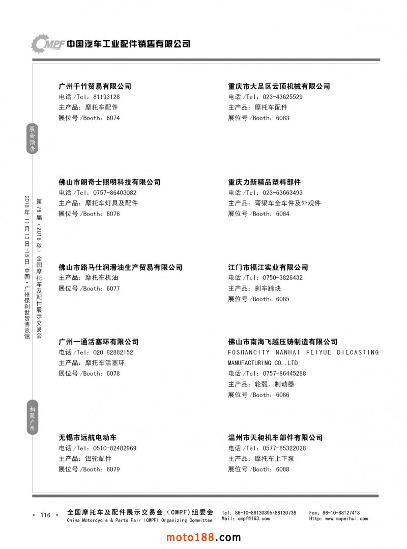 內116 第75屆(2018春)全國摩托車及配件展示交易會-重慶站參展企業(yè)信息