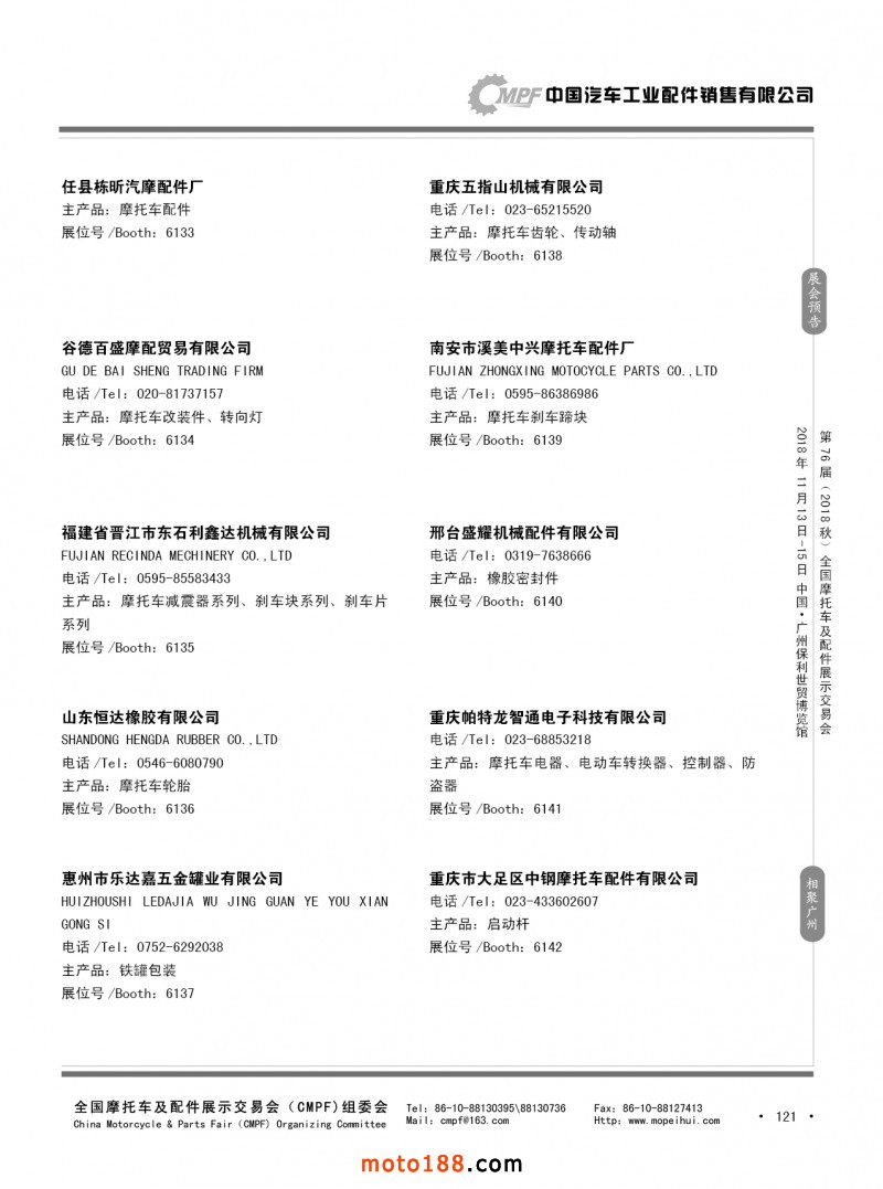 內(nèi)121 第75屆(2018春)全國摩托車及配件展示交易會-重慶站參展企業(yè)信息