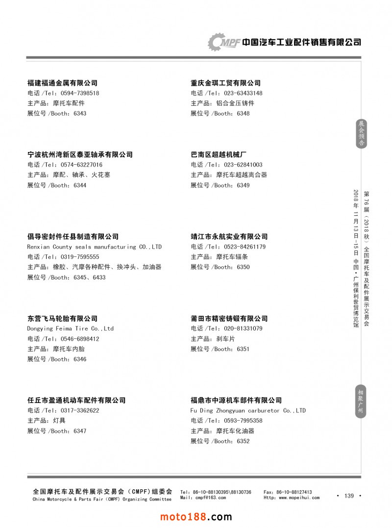 內(nèi)139 第75屆(2018春)全國摩托車及配件展示交易會(huì)-重慶站參展企業(yè)信息