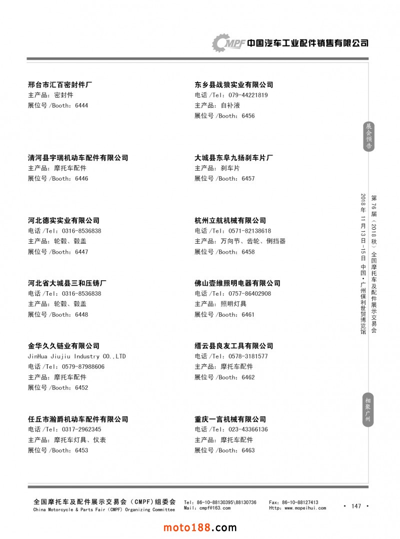 內(nèi)147 第75屆(2018春)全國摩托車及配件展示交易會-重慶站參展企業(yè)信息