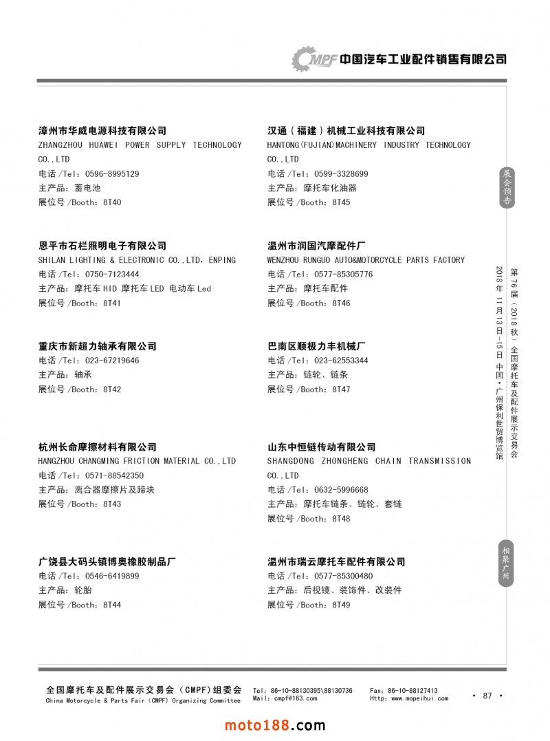 內(nèi)87 第75屆(2018春)全國(guó)摩托車及配件展示交易會(huì)-重慶站參展企業(yè)信息