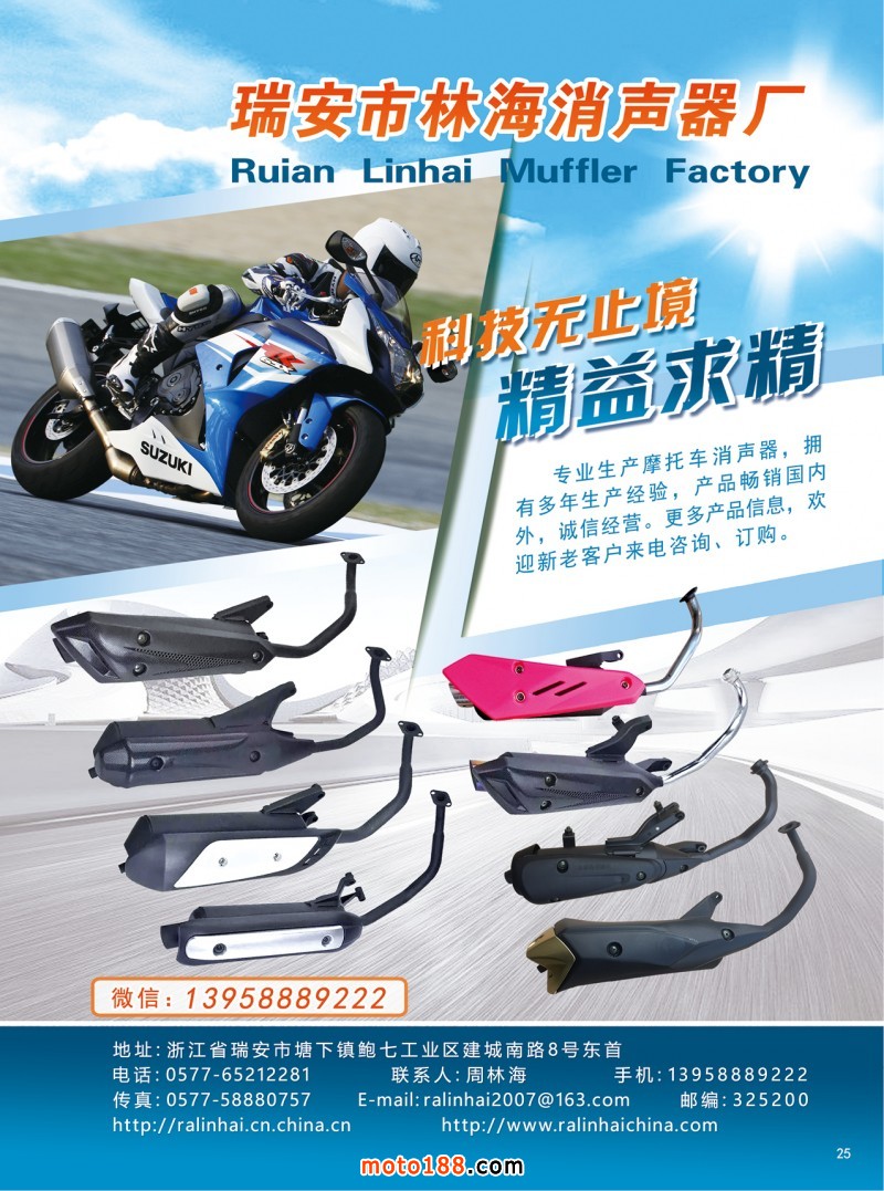 2018.5月《摩托車/電動(dòng)車與配件》雜志,歡迎大家閱讀日期:2018-04-25 點(diǎn)擊:1899 查看原圖 全部展開![]() ![]() ![]() 內(nèi)25 瑞安市林海消聲器廠