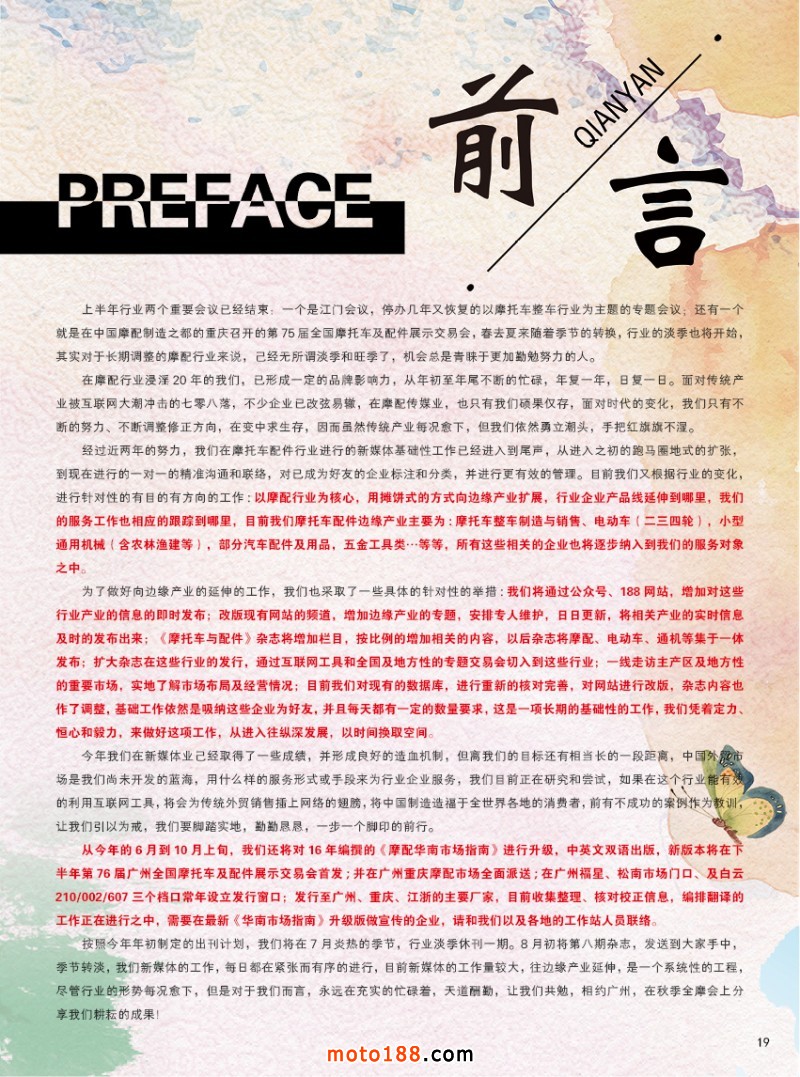 按照今年年初制定的出刊計(jì)劃,我們將在7月炎熱的季節(jié),行業(yè)淡季休刊一期。8月初將第八期雜志,發(fā)送到大家手中,季節(jié)轉(zhuǎn)淡,我們新媒體的工作,每日都在緊張而有序的進(jìn)行,目前新媒體的工作量較大,往邊緣產(chǎn)業(yè)延伸,是一個(gè)系統(tǒng)性的工程,盡管行業(yè)的形勢(shì)每況愈下,但是對(duì)于我們而言,永遠(yuǎn)在充實(shí)的忙碌著,天道酬勤,讓我們共勉,相約廣州,在秋季全摩會(huì)上分享我們耕耘的成果!