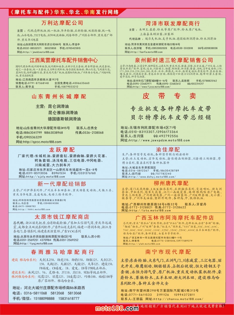 從現(xiàn)在到10月上旬,我們還將對16年編撰的《摩配華南市場指南》進(jìn)行升級,中英文雙語出版,新版本將在下半年第76屆廣州全國摩托車及配件展示交易會首發(fā);并在廣州重慶摩配市場全面派送;在廣州福星、松南市場門口、及白云210/002/607三個檔口常年設(shè)立發(fā)行窗口;發(fā)行至廣州、重慶、江浙的主要廠家,目前收集整理、核對校正信息,編排翻譯的工作正在進(jìn)行之中,需要在最新《華南市場指南》升級版做宣傳的企業(yè),請和我們以及各地的工作站人員聯(lián)絡(luò)。