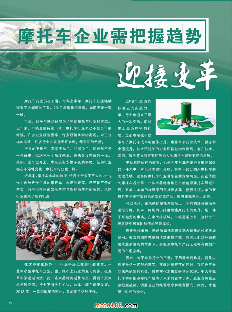 目前電動車新國標即將實行,3C標準的強制認證,國家新能源的戰(zhàn)略布局,也將給中國摩托車和電動車產(chǎn)業(yè)帶來革命性的變化,催生出未來的產(chǎn)品摩電或電摩:既有摩托車的速度和續(xù)駛里程,又有電動車的靜音無污染的工況…目前越來越多的企業(yè),正在朝著這個方向努力,并且已經(jīng)生產(chǎn)出不錯的產(chǎn)品,并推向市場,申請生產(chǎn)資質(zhì)的企業(yè)增多,隨著產(chǎn)品性能的提高和完善,相應的配套政策出臺,消費者不斷的增加,新能源電摩將會是市場新的消費熱點,我們未雨綢繆提早布局于這個未來新興市場,我們雜志也將定位于《電摩與配件》。 同時我們的服務形式也將逐步以新媒體來取代傳統(tǒng)媒體,今年大力度的壓縮出刊期數(shù),增加更多的新媒體的服務新形式,用更快捷、經(jīng)濟、方便、有效的方式和手段來服務于未來的企業(yè)。