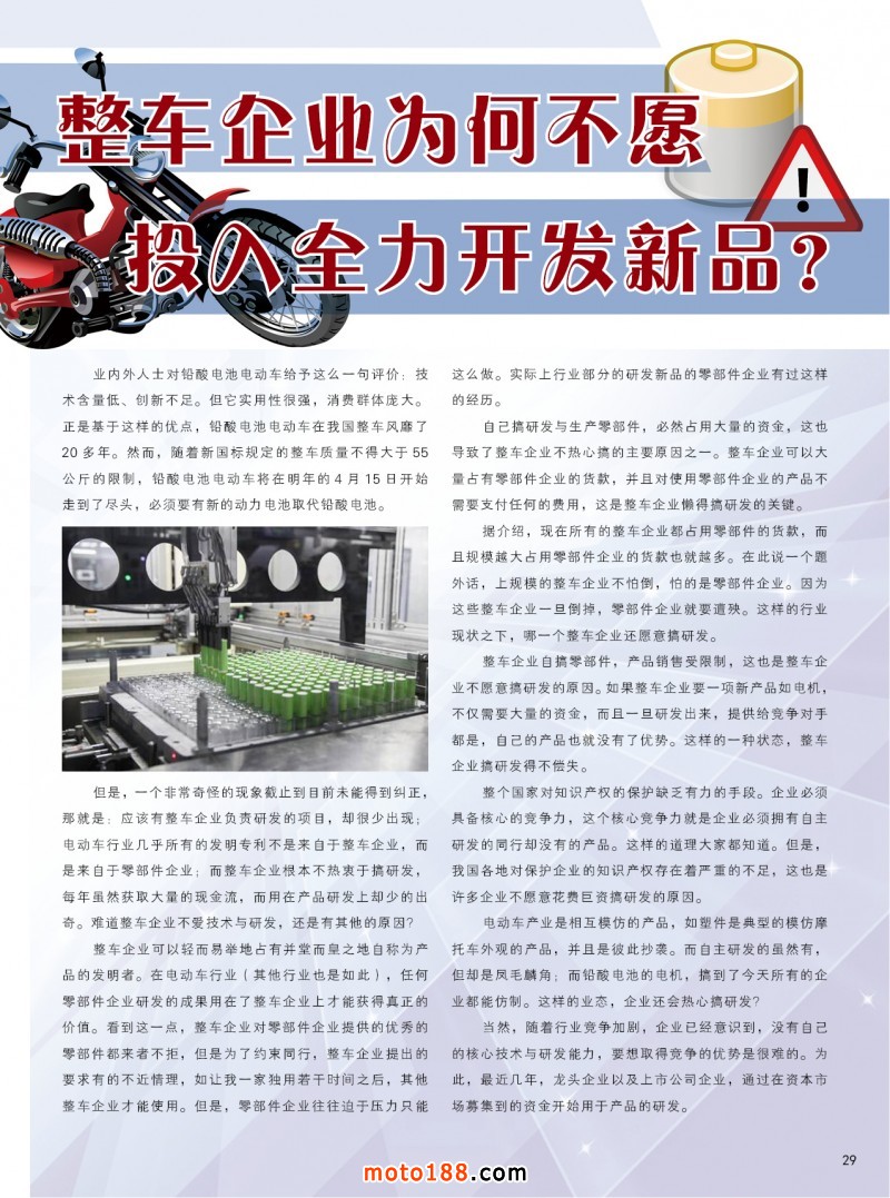 目前電動車新國標(biāo)即將實行,3C標(biāo)準(zhǔn)的強制認證,國家新能源的戰(zhàn)略布局,也將給中國摩托車和電動車產(chǎn)業(yè)帶來革命性的變化,催生出未來的產(chǎn)品摩電或電摩:既有摩托車的速度和續(xù)駛里程,又有電動車的靜音無污染的工況…目前越來越多的企業(yè),正在朝著這個方向努力,并且已經(jīng)生產(chǎn)出不錯的產(chǎn)品,并推向市場,申請生產(chǎn)資質(zhì)的企業(yè)增多,隨著產(chǎn)品性能的提高和完善,相應(yīng)的配套政策出臺,消費者不斷的增加,新能源電摩將會是市場新的消費熱點,我們未雨綢繆提早布局于這個未來新興市場,我們雜志也將定位于《電摩與配件》。 同時我們的服務(wù)形式也將逐步以新媒體來取代傳統(tǒng)媒體,今年大力度的壓縮出刊期數(shù),增加更多的新媒體的服務(wù)新形式,用更快捷、經(jīng)濟、方便、有效的方式和手段來服務(wù)于未來的企業(yè)。