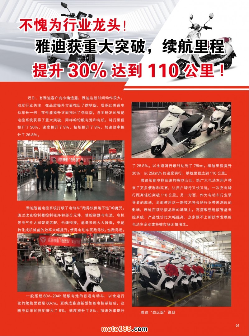 內(nèi)61 不愧為行業(yè)龍頭!雅迪獲重大突破,續(xù)航里程提升30%達(dá)到110公里!