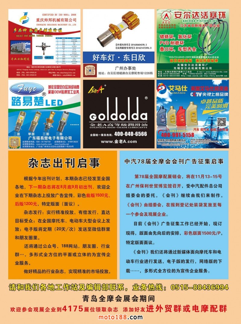 通機(jī)行業(yè)是摩托車(chē)發(fā)動(dòng)機(jī)類(lèi)的企業(yè)產(chǎn)品的延伸,目前在這個(gè)行業(yè)我們也發(fā)現(xiàn)了許多的商機(jī),通用的小型發(fā)動(dòng)機(jī)是我們各行各業(yè)的機(jī)械化的必備設(shè)備,動(dòng)力的來(lái)源,通過(guò)這種小型動(dòng)力機(jī)械,我們的服務(wù)線(xiàn)可以延伸到:農(nóng)機(jī)、園機(jī)、建機(jī)、工機(jī)、林機(jī)、漁機(jī)……目前已經(jīng)著手布局往這個(gè)行業(yè)進(jìn)軍,由于雜志的內(nèi)容的限制,我們準(zhǔn)備新建通機(jī)行業(yè)的公眾號(hào),增加對(duì)通機(jī)行業(yè)的信息發(fā)布,同時(shí)我們的網(wǎng)站也將進(jìn)一步完善功能,為通機(jī)行業(yè)留下接口,我們的服務(wù)線(xiàn)也在往這個(gè)方向延伸。下半年我們將在三個(gè)公眾號(hào)(摩托車(chē)、電動(dòng)車(chē)、通機(jī))上發(fā)力,將雜志壓縮期數(shù)的缺憾,通過(guò)新媒體新的形式來(lái)彌補(bǔ)。