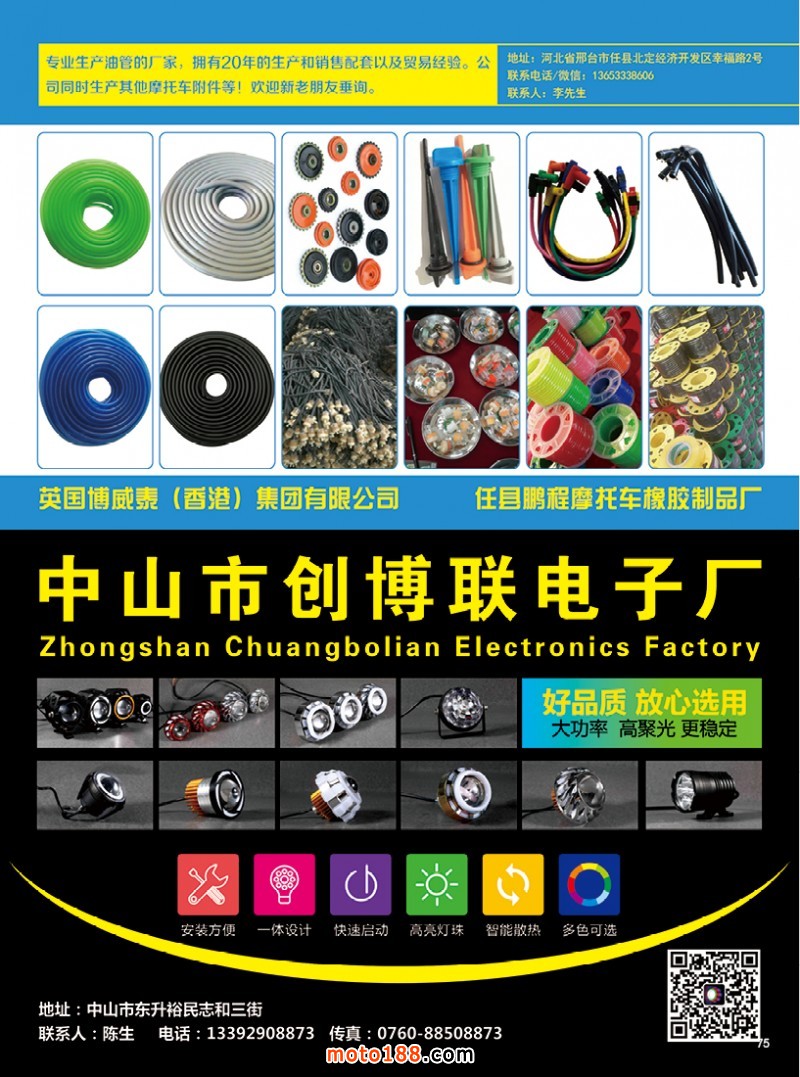 第18屆中國(guó)國(guó)際摩托車博覽會(huì)將于9月19-22日在重慶國(guó)際博覽中心舉行,本期雜志除正常發(fā)行之外,還將在重慶摩博會(huì)上發(fā)行。同時(shí)我們將做好終極版的《電摩與配件》11月雜志,以及廣州摩配會(huì)的《會(huì)刊》,善始善終,以完美的結(jié)局進(jìn)行收尾,不負(fù)行業(yè)不負(fù)你,不忘初心方得始終。