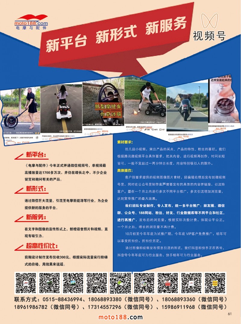 由于我們新媒體業(yè)務的迅速發(fā)展,已取代傳統(tǒng)的媒體,業(yè)務量已經超過了我們傳統(tǒng)媒體,并取而代之成為主業(yè)務?!峨娔εc配件》(原《摩托車與配件》)雜志也將完成歷史的使命,我們做好終極版的《電摩與配件》11月期即本期雜志,以及廣州摩配會的《會刊》。善始善終,以完美的結局進行收尾,不負行業(yè)不負你我,不忘初心方得始終!