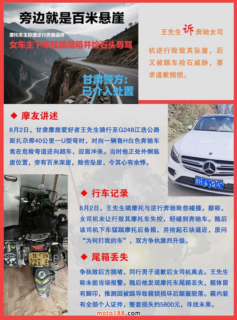 內8 旁邊就是百米懸崖摩托車主稱遭逆行奔馳逼停女車主下車猛踹尾箱并撿石頭辱罵甘肅警方已介入處置