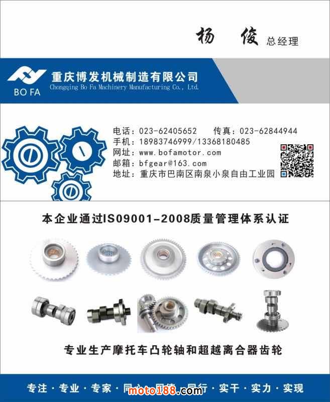 重慶博發(fā)機(jī)械制造有限公司專業(yè)生產(chǎn)摩托車各型凸輪軸,產(chǎn)品規(guī)格齊全、種類豐富。目前與重慶宗申、力帆、隆鑫、廣州天馬、北方易初等各大主機(jī)廠配套,質(zhì)量讓用戶滿意,價(jià)格讓用戶驚喜。現(xiàn)誠尋區(qū)域經(jīng)銷商和外貿(mào)客戶,歡迎來電咨詢洽談(免費(fèi)索樣)聯(lián)系人:楊總:13368180485