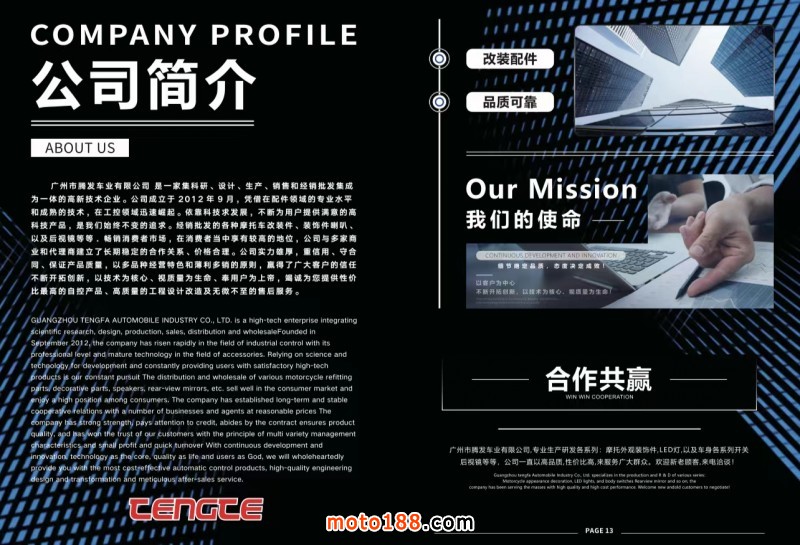 廣州市騰發(fā)車業(yè)有限公司,專業(yè)生產(chǎn)研發(fā)各系列:摩托外觀裝飾件,LED燈,以及車身各系列開(kāi)關(guān),后視鏡等等,公司一直以高品質(zhì),性價(jià)比高,來(lái)服務(wù)廣大群眾。歡迎新老顧客,來(lái)電洽談!