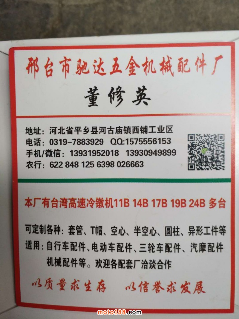 河北邢臺(tái)馳達(dá)五金機(jī)械配件廠擁有臺(tái)灣機(jī)多臺(tái)專業(yè)生產(chǎn)各種冷墩件、管件等異型件,主要用于汽摩配件、機(jī)械配件、五金工具、電動(dòng)自行車配件、精密機(jī)械配件等均可加工定制(定制直徑5mm-30mm,長度5mm-100mm)。