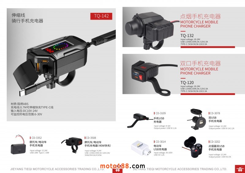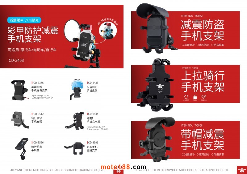 主要生產(chǎn)摩托車、電動(dòng)車、自行車、手機(jī)USB充電器和充電手機(jī)支架