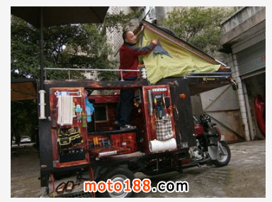 核心提示: 用農用三輪摩托車改裝,在面積不超過3平方米的車廂上,有廚房、臥室、書桌和各種野外生存工具等。經過查看各種資料和對比,何