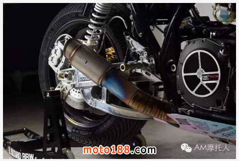 車輛改裝的重點放在了性能的提升和造型的設(shè)計上。因此,除了車架、油箱和車把之外,其他的部件全部為改裝件,這就導(dǎo)致車重驟降了25%,從245kg降到了183kg。同時,通過加大發(fā)動機進(jìn)氣量,提高壓縮比(從9.7:1提高到10.7:1),更換鈦合金的連桿和缸頭等一些列改裝,使得馬力暴增到了148hp。大馬力低配重,引擎輸出的功率比和市面上的運動型賽車絕對有一拼,介于BMW S1000 RR 和Ducati 1299 Panigale之間。