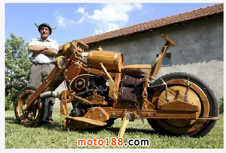 匈牙利的蒂薩厄爾什,普斯卡斯(Istvan Puskas)站在他自制的木制摩托車旁擺拍。普斯卡斯是一名拖拉機(jī)手。他花了約兩年的時(shí)間用木頭制作了這輛摩托車。