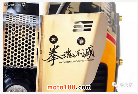 ‘拳魂不滅’中文字樣與底下的英文‘BOXERMOTOR NEVER DIE’是這臺(tái)車(chē)的主題,R-nineT 采用水平對(duì)臥空油冷引擎又被稱(chēng)為拳擊手引擎,所以這臺(tái)車(chē)除了是一種 BMW 特有引擎的精神傳遞外,透過(guò)這串主題向 BMW 經(jīng)典引擎致敬。
