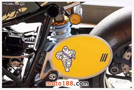 左方腳踏上還有一塊類(lèi)似賽車(chē)號(hào)碼牌的設(shè)計(jì),但刻意不填上編號(hào)的原因據(jù)設(shè)計(jì)者表示,其實(shí)是希望讓車(chē)輛有種隨時(shí)可以參賽,卻又還沒(méi)決定正式編號(hào)的感觸,因此上端只有貼上輪胎廠商米其林的貼紙,底部的鋁合金也有做舊化處理,增添質(zhì)感。