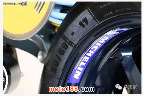 前后輪均采用 MICHELIN 米其林所生產(chǎn)的競(jìng)技胎種,因此后輪輪胎規(guī)格也是少見(jiàn)的 20/69-17 全熱熔胎種。