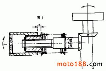 2. 發(fā)動(dòng)機(jī)后傳動(dòng)部分緩沖軸在車輛突然減速行駛時(shí)起不到緩沖作用,這也是加劇齒輪減速接觸面磨損的又一原因。后傳動(dòng)緩沖軸的傳動(dòng)結(jié)構(gòu) 如圖1 所示,發(fā)動(dòng)機(jī)在啟動(dòng)或加速時(shí),通過傳動(dòng)軸將旋轉(zhuǎn)運(yùn)動(dòng)傳遞給傳動(dòng)套,傳動(dòng)套開始沿與之梯形螺紋配合的花鍵套旋轉(zhuǎn)前移,移動(dòng)距離 α 后,傳動(dòng)套開始?jí)嚎s緩沖彈簧,緩沖彈簧壓縮到一定程度,傳動(dòng)套才逐漸帶動(dòng)花鍵套作旋轉(zhuǎn)運(yùn)動(dòng),而花鍵套又通過與之配合的花鍵軸將運(yùn)動(dòng)傳遞給兩圓錐齒輪,然后由兩圓錐齒輪驅(qū)動(dòng)后輪,使摩托車前進(jìn)或加速行駛,從而避免了兩圓錐齒輪在摩托車啟動(dòng)或加速行駛時(shí)的剛性沖擊。當(dāng)急回油門,摩托車減速行駛時(shí),后輪由于慣性作用,使原從動(dòng)齒輪變?yōu)橹鲃?dòng)輪,原驅(qū)動(dòng)齒輪變?yōu)閺膭?dòng)輪,由于沒有相應(yīng)的緩沖結(jié)構(gòu),此時(shí),旋轉(zhuǎn)運(yùn)動(dòng)由圓錐齒輪 2 迅速傳遞給圓錐齒輪 1 ,如果存在齒側(cè)間隙,那么兩圓錐齒輪的減速接觸面肯定會(huì)產(chǎn)生剛性沖擊,從而出現(xiàn)異常的沖擊噪聲。從實(shí)物的檢測(cè)看,兩圓錐齒輪減速接觸面的沖擊磨損痕跡非常明顯,這也就驗(yàn)證了我們分析的正確性。