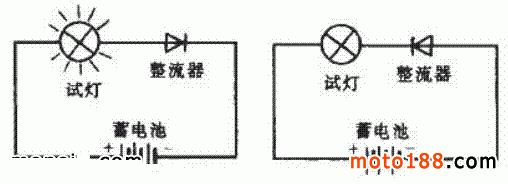 用蓄電池作電源,取一只儀表燈泡(燈泡額定電壓應(yīng)與蓄電池電壓相等),對硅二極管進行單向?qū)щ娦阅軝z查。方法見圖 2-19 所示:在蓄電池正負極上各接一根導(dǎo)線,使其通過試燈交替地接在硅二極管的兩電極上,這樣測試兩次。如果試燈一次亮一次不亮,說明這只硅二極管是良好的;如果兩次都亮,說明硅二極管已擊穿短路不能使用;如果兩次測試試燈全不亮,說明硅二極管內(nèi)部斷路而損壞。