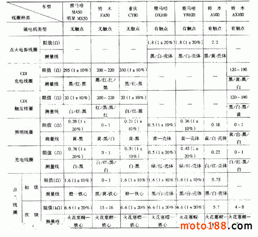 磁電機(jī)故障,有時(shí)可通過測(cè)量磁電機(jī)內(nèi)各線圈電阻值的方法來判定。下表中所列數(shù)據(jù)是線圈的正常阻值,測(cè)量時(shí)若線圈的阻值過小,說明線圈內(nèi)部有短路之處;若線圈阻值為無窮大,說明線圈內(nèi)部斷路。