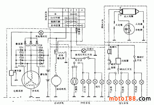 長(zhǎng)江750F 型正三輪摩托車的長(zhǎng)江750F1 型發(fā)動(dòng)機(jī)電路的工作原理如圖所示。整個(gè)電氣系統(tǒng)可分為點(diǎn)火系統(tǒng)、電源系統(tǒng)、啟動(dòng)系統(tǒng)、照明系統(tǒng)和信號(hào)系統(tǒng)。