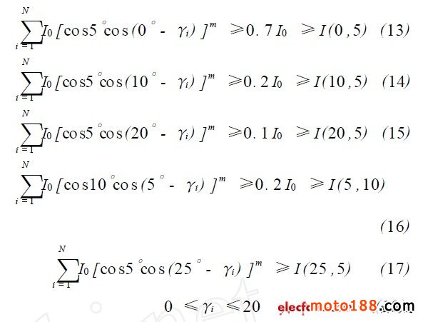 EXT-INDENT: 0px; PADDING-TOP: 0px; WHITE-SPACE: normal; LETTER-SPACING: normal; BACKGROUND-COLOR: rgb(255,255,255); orphans: 2; widows: 2; -webkit-text-size-adjust: auto; -webkit-text-stroke-width: 0px"> 上述方程組若γi 為方程的解,則- γi 亦為方程組的解。考慮實(shí)際加工燈具的方便, 假設(shè)γi 為等差數(shù)列。只需從方程(10) —(18) 中求解出一組滿意解γi , 即可以將水平方向的發(fā)散角擴(kuò)散到20°,從而實(shí)現(xiàn)對(duì)摩托車信號(hào)燈的配光設(shè)計(jì)。