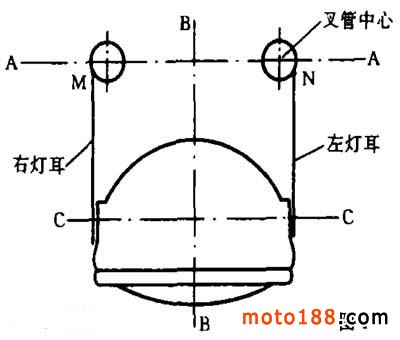 摩托車被碰撞后前照燈光束偏射,大都是由于燈耳彎曲、叉管彎曲、上下聯(lián)板相對位置偏移而引起。將這些零件整直矯正,如果忽視燈耳與套連接的根部位置 M 與 N (圖1)的位置恢復(fù),是很難使光束正射的。