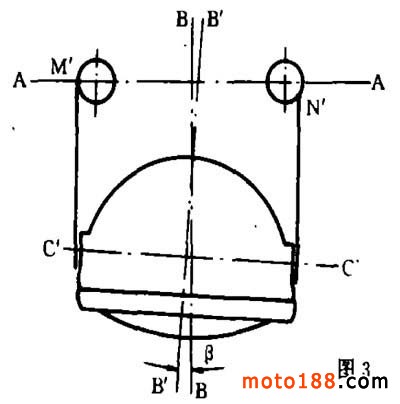 CC 與 AA 平行否,與 M 、 N 點(diǎn)位置有關(guān)。經(jīng)過撞偏以后的前照燈(見圖2),修復(fù)時,由于往往只注意將燈耳整直,忽視了 M 、 N 點(diǎn)的位置,使 M 、 N 的正確位置移動成 M′、N′位置(見圖3 ),使 C′C ′與 AA 不平行,前照燈光束仍然偏射。偏射方向 B′B′與正射方向 BB 成一角度 β 。