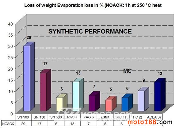 而來自瑞士的Motorex,在250度的高溫環(huán)境下,持續(xù)運(yùn)轉(zhuǎn)1小時,驗證機(jī)油在這樣的環(huán)境下會損失多少機(jī)油量。經(jīng)過一小時的測試,經(jīng)由SN100提煉法的礦物油,燒機(jī)油現(xiàn)象達(dá)到29%,而采用PAO與Ester等提煉方式的基礎(chǔ)油,僅損失7%、5%,因此可比較出礦物油與”真正”全合成機(jī)油的差異性。