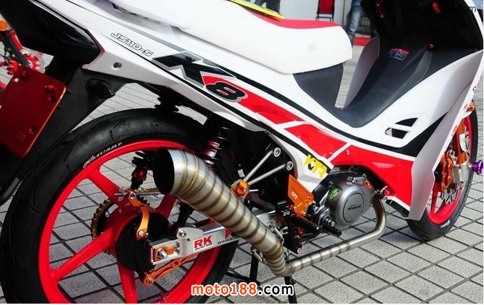 在性能方面,KTR選用了機(jī)油冷卻器來保證發(fā)動機(jī)持續(xù)高溫狀態(tài)下的良好表現(xiàn),同時,最為搶眼的莫過于一根手工焊接排氣管了,精細(xì)的工藝、夸張的全段直通排氣,仿佛看到它的時候就聽見了GP賽場上那震耳欲聾的澎湃氣浪!該車的前后減震均做了更換,而該車的后減震更是由一家臺灣高檔摩托車減震生產(chǎn)企業(yè)為K8量身打造而成的,用料十足,做工講究。
