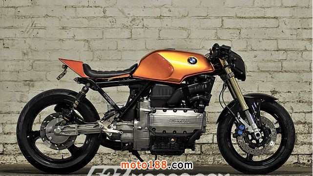 另外這款采用金橘色涂裝的K100,也是采用重新制作的油箱、座墊與小尾包,并且把車尾多馀的副車架進(jìn)行切除!保留了短尾的風(fēng)格,并且把腳踏位置也順勢(shì)后移!同時(shí)還移植了不少其他車款的零部件,包然頭燈采用Yamaha MT-03的部品,K1100的前后輪圈、K1200 R的煞車卡鉗等等,排氣則是采用美國Supertrapp套件等。