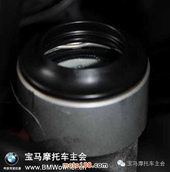 新油封拿在手里一看,麻煩了,不知道正反面。仔細(xì)一看上邊是有個(gè)小槽子標(biāo)記。然后我找到舊油封一看,有同樣的標(biāo)記。那就好辦了。原來(lái)是槽子朝上的,新油封按照這個(gè)方向放進(jìn)去: