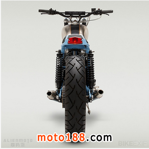 特別值得一提的是,為了和P.K. Ripper的風(fēng)格保持一致,XS650原車的輻條輪轂被更換為和自行車輪轂造型類似的“板輪”(Metzeler ME880前130/80-17, 后140/90-16)。此外,腳啟動桿的設(shè)計也絕對是點睛之筆。來自BMX自行車上的腳踏板完美的變身為“打火棍”。銀色的腳踏板和車身融合的恰當好處,完全沒有違和感。