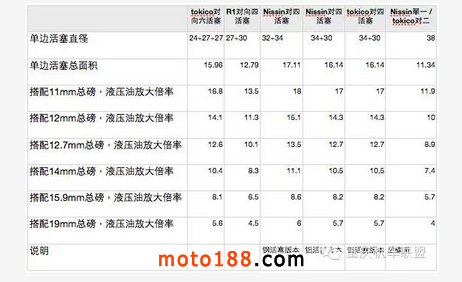 了解了原理以后,我們?yōu)榱艘窒苈放蛎洉r候所吃掉的油量,所以上磅的出油量一定要有一定的比例,所以口徑越大不一定越好的觀念,在這里可以得到證實。一般放大功率多半車廠都會選擇盡量不低于10倍,如果低于十倍,代表你的剎車力到手的力量要很大,但是如果高于17倍,你就得考慮到剎車系統(tǒng)的精密度了,如果功效倍率那么大,精密度卻不夠那也會導致剎車失靈。因為會產(chǎn)生過大的間歇,也就是出油量過低。