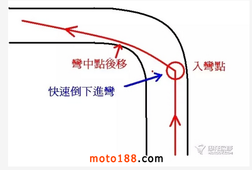 用力的counter steer車子就會(huì)很快的入彎下去。輕輕的推拉手把,車子轉(zhuǎn)的就慢。不同的彎道可能需要不同的技術(shù)。 過彎的關(guān)鍵大概是路線,傳統(tǒng)的車手習(xí)慣使用順暢的路線,現(xiàn)在的車手比較喜歡晚一點(diǎn)入彎,把彎中點(diǎn)APEX也深入彎一些。